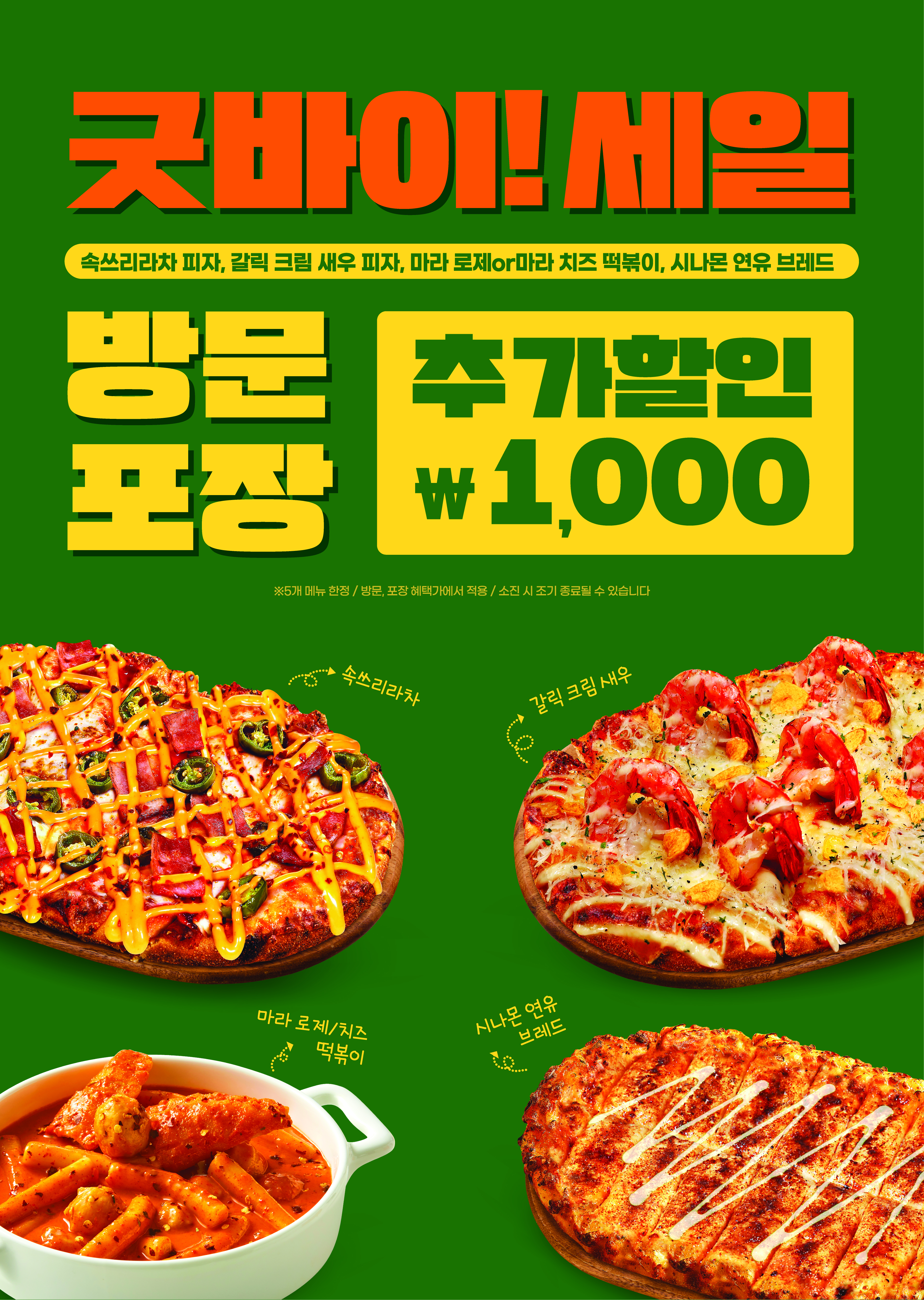 이벤트 기간 내 속쓰리라차 피자/갈릭 크림 새우 피자/마라 로제 or 치즈 떡볶이/시나몬 연유 브레드