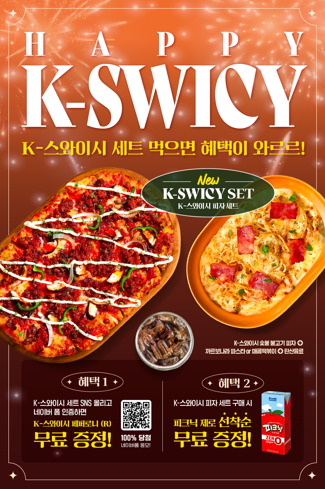 *세트 구성: K-스와이시 3종 R 또는 L 사이즈 + 매콤 떡볶이 또는 까르보나라 파스타 + 탄산음료
